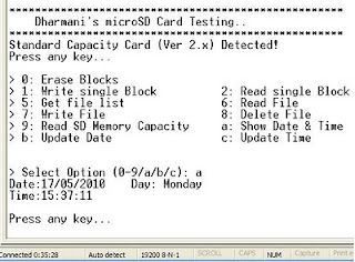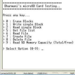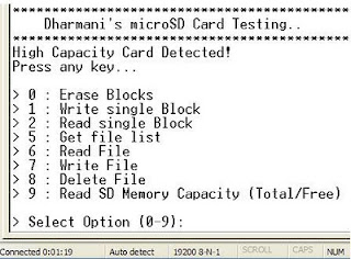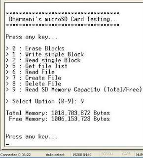 Once raw data transfer achieved, I formatted the card with windowsXP (FAT32) and loaded it with some text files, directories and other files (all stored in root directory of the card). After that I wrote the FAT32 routines to read files, get file list (using HyperTerminal again), finding the total/free memory of card. All this data is sent to HyperTerminal by the uc.