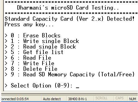 1: Writes data to specified SD block address. Data to be entered in HyperTerminal using PC keyboard